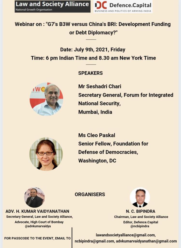 The two strategic affairs experts were discussing “G7’s B3W versus CCP’s BRI: Development Funding or Debt Diplomacy” at a webinar hosted by Law and Society Alliance, a Delhi-headquartered think-tank, and DefenceCapital, a strategic affairs publication.